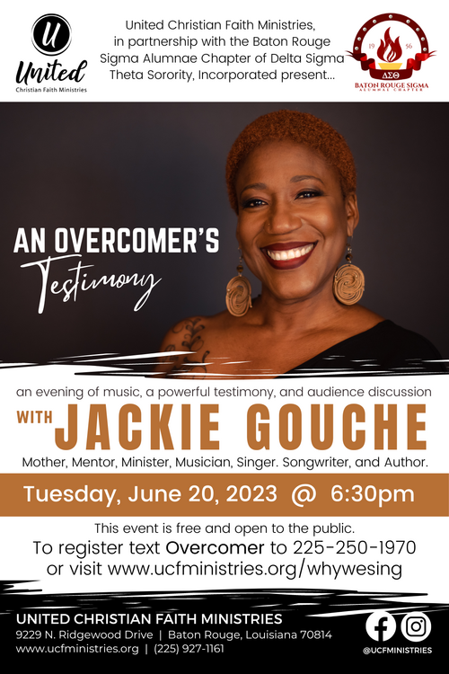 United Christian Faith Ministries (UCFM) in partnership with the Baton Rouge Sigma Alumnae Chapter of Delta Sigma Theta Sorority, Incorporated is hosting "An Overcomer's Testimony" - a night of music and a powerful testimony with Jackie Gouche. The event will be held at 6:30pm on Tuesday, June 20th at UCFM, 9229 N. Ridgewood Dr. Baton Rouge, LA 70814.